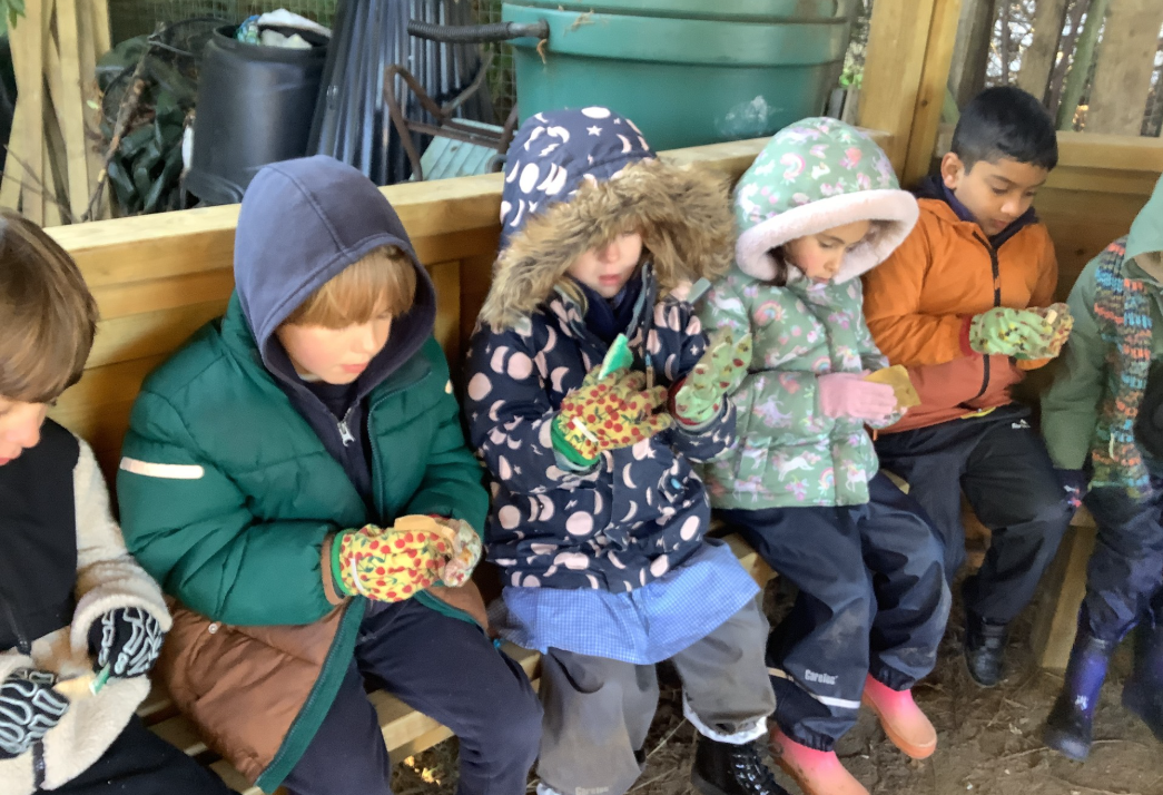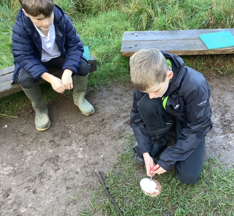 Nature School braved the rain again last week! Children have been making bird feeders using lard and a variety of seeds. They are dotted all around the school site – how many can you spot?