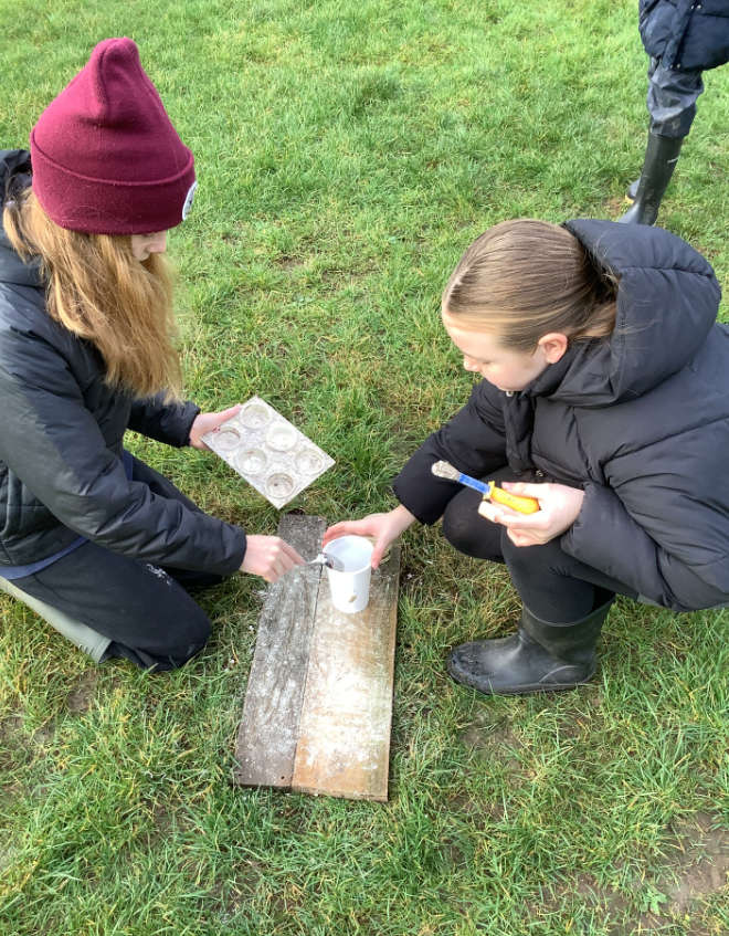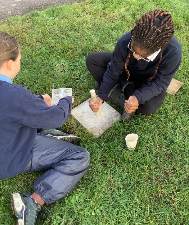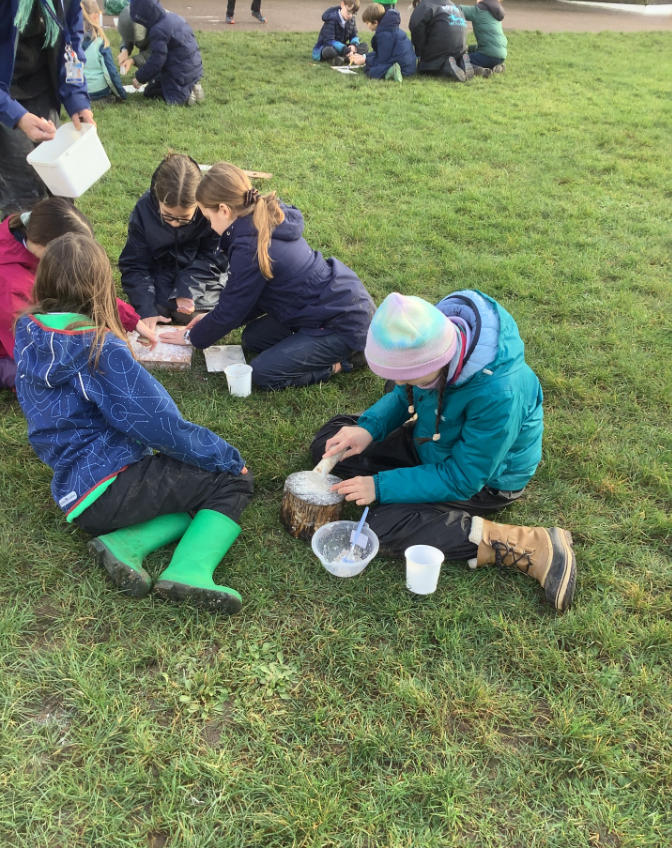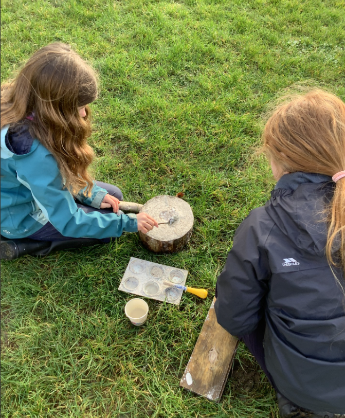 This week , Racer, and Rattlesnake all enjoy the process of using chalk to make natural paint. They used mallets to break up large pieces into chunks before grinding this down into a smooth paste to use as a paint.