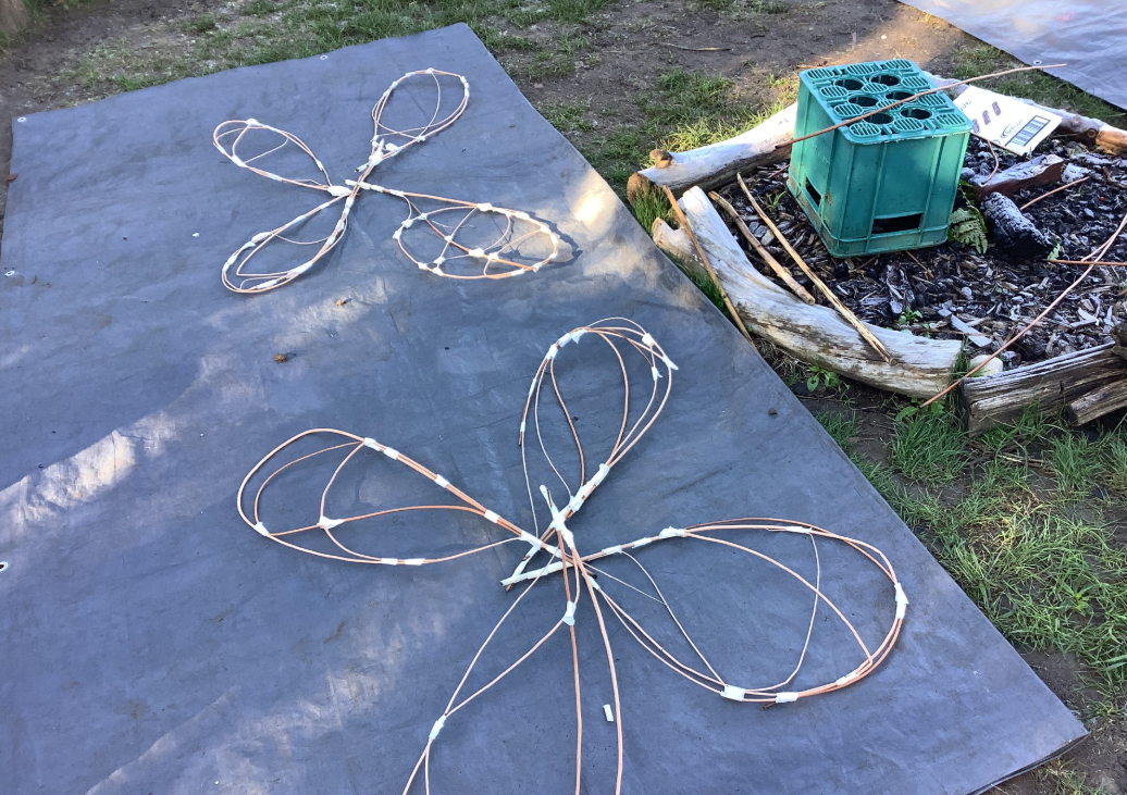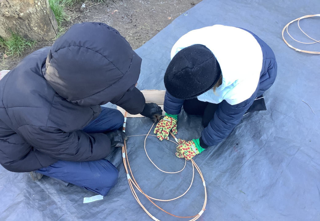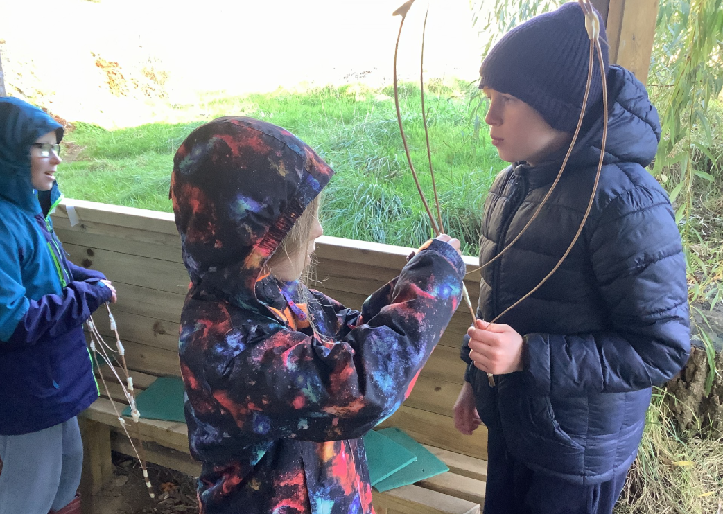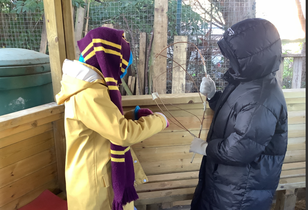Y6 have been helping to create structures for a woodland walk. Here they are making wings for a dragonfly and for native moths, using willow and tissue paper.