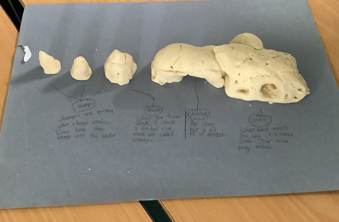 We have been learning about the erosion of our coasts and have made salt dough models showing how the sea and weather can transform a crack in the soft rock of a cliff into a cave, arch, stack and stump.