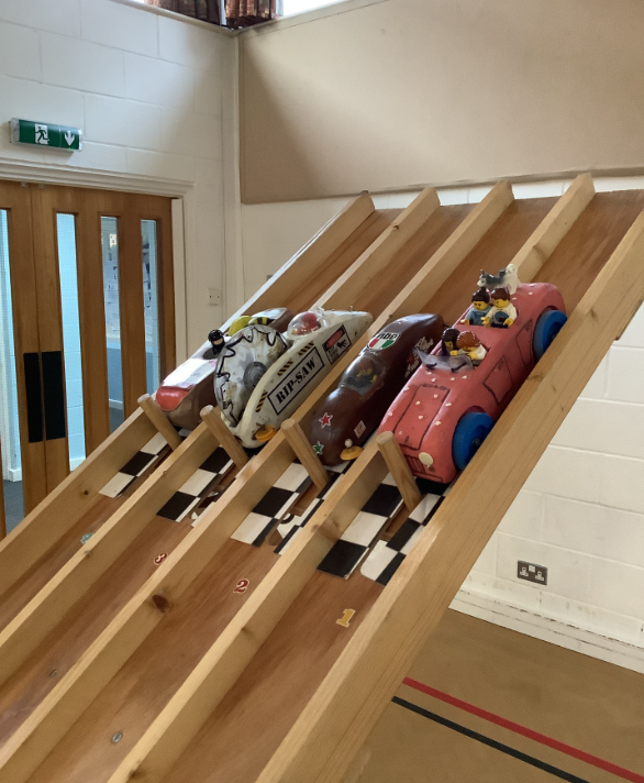 This week, we were visited by Marco Holt, who is an engineer. He held a force-based science workshop with each class in the sports hall, looking at how to create the fastest cars to race down a ramp.