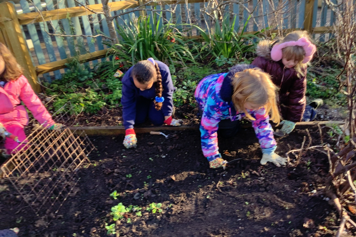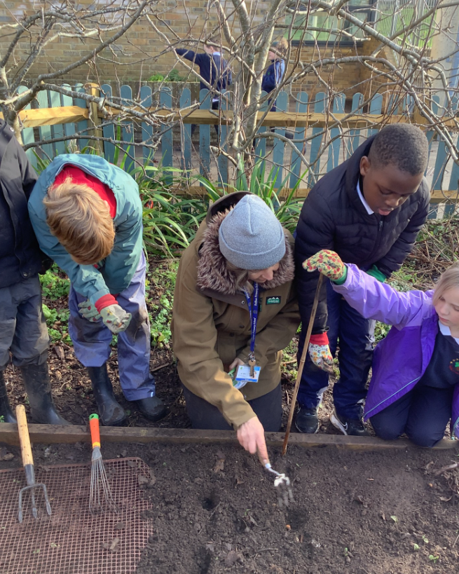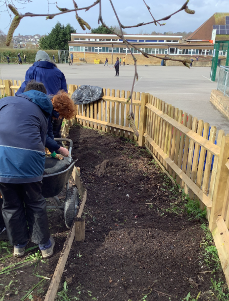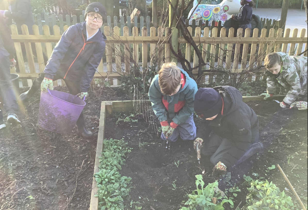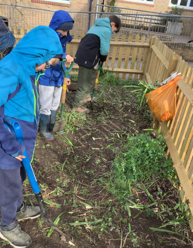 Orbit class helped to prepare the bed in the kitchen garden. They were then able to sow broad beans and garlic.