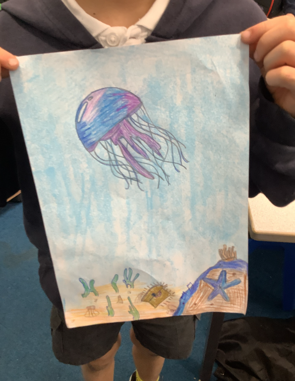 We have spent quite a bit of time in planning and creating our own pieces of ‘blue sea-creature art’ for the Balfour art exhibition. We used a range of media including chalks, paint, pencils and pens.