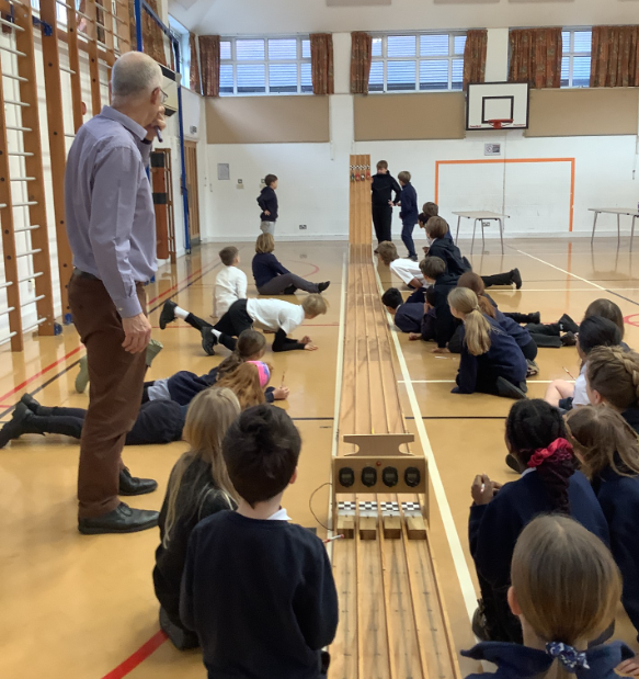 This week, we were visited by Marco Holt, who is an engineer. He held a force-based science workshop with each class in the sports hall, looking at how to create the fastest cars to race down a ramp.
