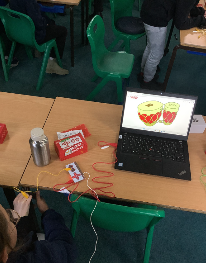 DT: We are learning about complex switches using the Makey-Makeys this half-term. This week, the children have been getting to grips with how to program and use them through playing with them and Scratch.